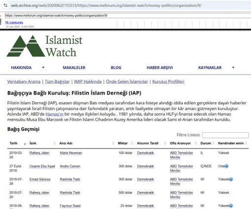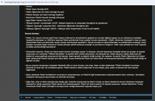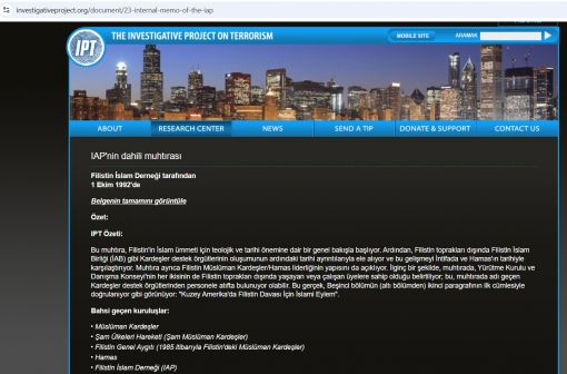 IAP'nin dahili muhtırasıFilistin İslam Derneği tarafından BELGE: https://www.investigativeproject.org/documents/23/internal-memo-of-the-iap.pdf IPT Özeti: Bu muhtıra, Filistin'in İslam ümmeti için teolojik ve tarihi önemine dair bir genel bakışla başlıyor. Ardından, Filistin toprakları dışında Filistin İslam Birliği (İAB) gibi Kardeşler destek örgütlerinin oluşumunun ardındaki tarihi ayrıntılarıyla ele alıyor ve bu gelişmeyi İntifada ve Hamas'ın tarihiyle karşılaştırıyor. Muhtıra ayrıca Filistin Müslüman Kardeşler/Hamas liderliğinin yapısını da açıklıyor. İlginç bir şekilde, muhtırada, Yürütme Kurulu ve Danışma Konseyi'nin her ikisinin de Filistin toprakları dışında yaşayan veya çalışan üyelere sahip olduğu belirtiliyor; bu, muhtırada adı geçen Kardeşler destek örgütlerinden personele atıfta bulunuyor olabilir. Bu gerçek, Beşinci bölümün (altı bölümden) ikinci paragrafının ilk cümlesiyle doğrulanıyor gibi görünüyor: "Kuzey Amerika'da Filistin Davası İçin İslami Eylem". Bahsi geçen kuruluşlar: