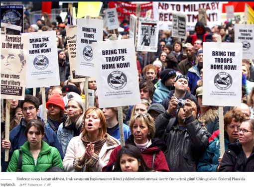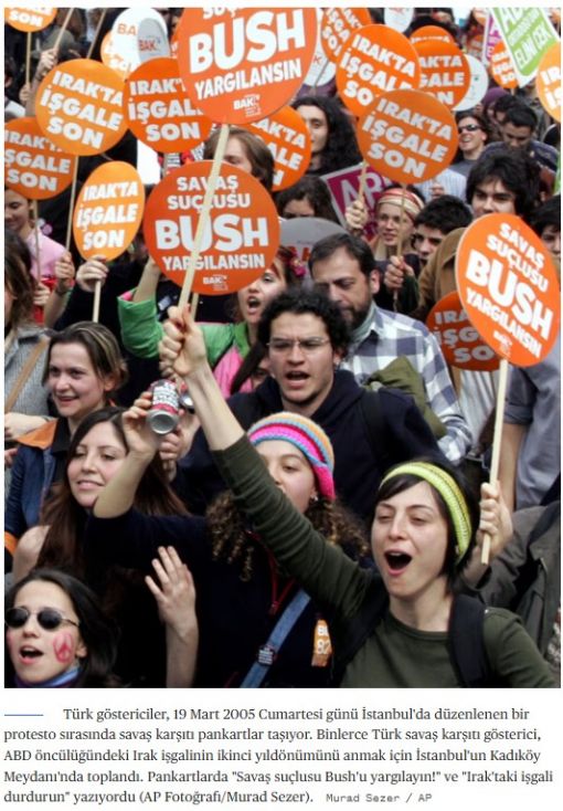 Türk göstericiler, 19 Mart 2005 Cumartesi günü İstanbul'da düzenlenen bir protesto sırasında savaş karşıtı pankartlar taşıyor. Binlerce Türk savaş karşıtı gösterici, ABD öncülüğündeki Irak işgalinin ikinci yıldönümünü anmak için İstanbul'un Kadıköy Meydanı'nda toplandı. Pankartlarda "Savaş suçlusu Bush'u yargılayın!" ve "Irak'taki işgali durdurun" yazıyordu (AP Fotoğrafı/Murad Sezer).Murad Sezer / AP