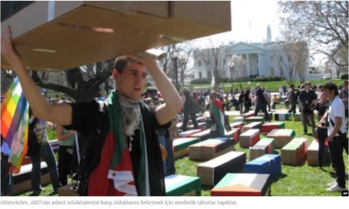 Göstericiler, ABD'nin askeri müdahalesine karşı olduklarını belirtmek için sembolik tabutlar taşıdılar.