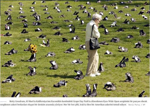 Gözler Tamamen Açık adlı sergide , her biri Irak'ta ölen bir ABD askerinin adının yazılı olduğu, sıra sıra dizilmiş 800 çift askeri bot sergileniyor.