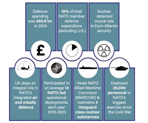 Kaynak: NATO Yıllık Raporu 2024; Avam Kamarası Kütüphanesi: Birleşik Krallık silahlı kuvvetlerinin operasyonel taahhütleri 2025 6. Euro-Atlantik genelinde kolektif güvenliğimizi artırabileceğimiz başka yollar da var. Ortak Seferberlik Gücü'ndeki (Joint Expeditionary Force - JEF) liderliğimiz aracılığıyla, giderek daha tartışmalı hale gelen Yüksek Kuzey ve Kuzey Avrupa'da yenilenmiş caydırıcılık sağlayacağız. Aynı şekilde, deniz altı altyapısına yönelik potansiyel tehditleri izleyecek ve Rusya'nın gölge filolarının izini süreceğiz. Benzer şekilde, 2025 Fransa/Birleşik Krallık Zirvesi aracılığıyla Birleşik Ortak Seferberlik Gücü'nü (Combined Joint Expeditionary Force - CJEF) güçlendirmeye çalışacağız. 7. Ukrayna'nın geleceği, Euro-Atlantik bölgesindeki kolektif güvenliğin hayati bir parçasıdır. Rusya, Ukrayna halkına yıkıcı saldırılar düzenlemeye ve Ukrayna'nın meşru müdafaa hakkı üzerinde bir veto yetkisi (söz hakkı) gibi kabul edilemez taleplerde bulunmaya devam etmektedir. İşte bu nedenle Birleşik Krallık, Ukrayna'nın meşru müdafaasında —hem şimdi hem de gelecekte— onun yanında yer almaya devam etmektedir. Ukrayna'yı desteklemekteki temel hedefimiz, Rusya'nın daha fazla saldırganlık göstermesini engellemektir s. 31 8. Ukrayna'da kalıcı bir çözüm, Ukrayna'nın egemenliği ve güvenliğini savunan ve Ukrayna halkının kendi geleceğine şiddet veya zorlama tehdidi olmaksızın karar vermesine izin veren bir çözüm olacaktır. Savaşı sürdürürken Ukrayna’yı savunduğumuz gibi, barış arayışında da aynı bağlılığı göstereceğiz. Birleşik Krallık-Ukrayna 100 yıllık ortaklığı aracılığıyla, Ukrayna halkı için daha iyi bir gelecek için çerçeveyi inşa ediyoruz. Yenilenmiş çabalarımızın bir parçası olarak, Ukrayna Savunma İrtibat Grubu'nu toplamak için Avrupa'da ilk ülke biz olduk. Fransa ile yakın çalışarak, Ukrayna'ya Avrupa desteğini artırmak amacıyla 31 ülkenin katılımıyla Gönüllüler Koalisyonu'nu da kurduk. Birleşik Krallık, Ukrayna'nın Rusya'nın işgaline karşı kendini savunmasına ve ekonomisini büyütmesine destek verirken, Rusya üzerine baskıyı artırmakta ve Ukrayna'nın adaleti sağlamasına yardımcı olmada öncü bir rol oynamaktadır.