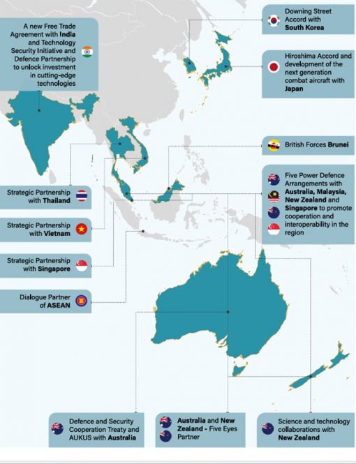 Birleşik Krallık Taşıyıcı Vuruş Grubu, Hint-Pasifik bölgesine çok uluslu bir göreve gönderildi. 16. Coğrafyamızın, güvenliğimizin ve ticaretin sert gerçekleri, Euro-Atlantik bölgesinin "Önce NATO" yaklaşımımızın bir parçası olarak önceliklendirilmesini zorunlu kılmaktadır. Ancak Rusya, Çin, İran ve Kuzey Kore gibi ülkelerin, bazen fırsatçı bir şekilde, bazen de stratejik bağları derinleştirerek farklı harekat alanlarında işbirliği yaptığına dair kanıtlar, Euro-Atlantik'in, Orta Doğu ve Hint-Pasifik gibi halihazırda güçlü ortaklıklarımızın bulunduğu farklı tiyatrolarla olan birbirine bağlılığını göstermektedir. SDR'nin belirttiği gibi, Euro-Atlantik'ten sonra bunlar, Birleşik Krallık savunması için ek iki öncelikli bölgedir. 17. Dahası, günümüz dünyasında uluslararası gücün dağınık ve yayılmış doğası, yakın çevremizin ötesine bakmamızın doğrudan bir ulusal çıkar (hard national interest) meselesi olduğu anlamına gelmektedir. İşte bu nedenle, dünyanın diğer bölgelerindeki dinamik ve yenilikçi ekonomilerle modern ortaklıklar kurmayı hedefliyoruz. Özellikle, birçoğu İngiliz Milletler Topluluğu (Commonwealth) ülkesi olan ve güçlü bir çıkar birliğini paylaştığımız, coğrafi olarak dünyaya yayılmış bir ülkeler grubu bulunmaktadır. Bu grup, Kuzey Atlantik'te Kanada'dan Okyanusya'da Yeni Zelanda'ya kadar uzanmakta; Körfez Ülkeleri, Hindistan, Singapur, Güney Kore, Endonezya, Japonya ve Avustralya'yı kapsamaktadır. Bu hızlı büyüyen ve gelişmiş ekonomiler; malların ve kaynakların serbest ticaretine, siyasi istikrar üzerine inşa edilmiş finansal piyasa güvenine, deniz güvenliğine ve s. 35 uluslararası deniz hukukunun öngörülebilir şekilde uygulanmasına dayanmaktadır. Ekonomik zorlama (coercion) ve uluslararası ekonomik düzenin büyük güçlerin etki alanlarına bölünerek parçalanması riskine karşı onlarla birlikte çalışmakta ortak bir çıkarımız bulunmaktadır. 18. Doğrudan bölgemizin ötesinde, diplomatik, insani, askeri ve refah alanındaki katkılarımız aracılığıyla, toplam 60 milyar sterlinlik ticareti de kapsayacak şekilde Orta Doğu'daki güvenlik ve istikrara katkıda bulunmayı taahhüt ediyoruz. Bölge, ticaret, yatırım, enerji ve insani yardım da dahil olmak üzere Birleşik Krallık için çok çeşitli öncelikler açısından çok önemli olduğu gibi, yüz binlerce Britanyalı vatandaşın da yaşadığı yerdir; bu nedenle Orta Doğu ve Kuzey Afrika’daki uluslararası güvenlik tehditleri doğrudan Birleşik Krallık çıkarlarını etkiler. Birleşik Krallık’ın bölgeye katkısı, DEAŞ’ı yenmek için Küresel Koalisyon’a destek, Birleşik Deniz Kuvvetleri ve Kızıldeniz'de seyir özgürlüğünü güvence altına alma çabalarını kapsamaktadır. Körfez ile derin ve kalıcı ikili ilişkilerimiz vardır; bölgedeki geniş kapsamlı stratejik ortaklıkları da içeren bu ilişkiler çerçevesinde Körfez İşbirliği Konseyi ile serbest ticaret anlaşmasını güvence altına almak için çalışıyoruz. Güvenli ve emniyetli bir İsrail ile iki devletli çözüm çerçevesinde Filistin devletliğinin ilerlemesini sağlama taahhüdündeyiz. Hem İsrailliler hem de Filistinliler barış, refah ve güvenlik içinde yaşama hakkına sahiptir. İran’ın istikrarsızlaştırıcı etkisini sınırlamak ve nükleer silah geliştirmesini önlemek için çalışıyoruz. 19. Hindistan, uluslararası sistemi şekillendirmede büyüyen bir role sahip, gerçek bir stratejik ortaklık aradığımız bir ülkedir. Yeni serbest ticaret anlaşmamız, dünyadaki en hızlı büyüyen ekonomilerden biriyle ticari bağları güçlendiren ve tarife engellerini azaltan önemli bir anlaşmadır. Teknoloji Güvenliği Girişimimiz aracılığıyla, gelişmiş teknolojilerin ön saflarında çığır açan yetenekler geliştiriyoruz ve Savunma Ortaklığımız aracılığıyla yetenek geliştirmeleri konusunda işbirliği yapıyoruz. 20. Birleşik Krallık'ın Hint-Pasifik'teki ikili ilişkileri ve ortaklıkları, paylaştığımız refahın bağlı olduğu uluslararası güvenliği artırmak için tasarlanmıştır. Bunlar arasında, Kore Cumhuriyeti ile Küresel Stratejik Ortaklık, ABD ve Avustralya ile Savunma ve Güvenlik İşbirliği Anlaşması ve AUKUS, İtalya ve Japonya ile yeni nesil savaş uçağının ortak geliştirilmesine yönelik Küresel Muharebe Hava Programı (GCAP) ve Yeni Zelanda ile bilim ve teknoloji işbirliği yer almaktadır. Birleşik Krallık'ın Uçak Gemisi Taarruz Grubu'nun bölgeye seyrüseferi ile bölgedeki istikrar taahhüdümüzü vurgulayacak, Birleşik Krallık'ın serbest ve açık bir Hint-Pasifik taahhüdünü yeniden teyit edeceğiz. Ayrıca, AUKUS, Malezya, Yeni Zelanda ve Singapur'daki ortaklarımızla birlikte çalışabilirliği ve işbirliğini teşvik etmek için Beş Güç Savunma Düzenlemeleri'ne (Five Power Defence Arrangements) yatırım yapmaya devam edeceğiz, bu da Birleşik Krallık'ın geçen yıl BERSEMA LIMA 24'e katılımıyla kanıtlanmıştır. 21. Güney Çin Denizi ve Tayvan Boğazı'nın merkeziliği, küresel ticaret ve tedarik zincirleri için kilit bir deniz yolu olarak Tayvan Boğazı'nın bölgesel istikrarı için önemini vurgulamaktadır. Tayvan sorununun, güç veya zorlama tehdidi olmaksızın, her iki tarafça yapıcı diyalog yoluyla barışçıl bir şekilde çözülmesi gerektiği konusunda kararlıyız. Mevcut durumu tek taraflı olarak değiştirmeye yönelik herhangi bir girişimi desteklemiyoruz. Tayvan ile gayri resmi ilişkimizin bir parçası olarak, paylaşılan demokratik değerlerle desteklenen geniş bir yelpazedeki alanlarda bağları güçlendirmeye ve büyütmeye devam edeceğiz. s. 36 22. AUKUS programı, Birleşik Krallık savunması ve kolektif güvenliği için, "Önce NATO" ancak yalnızca NATO olmayan bir yaklaşı