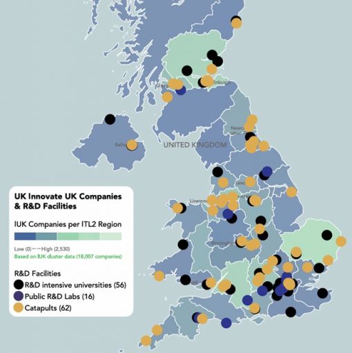 Kaynak: Hükümet Bilim Ofisi, Bilim İnovasyon ve Teknoloji Departmanı ile UKRI İnovasyon Kümeleri Verilerinin Analizi. Not: Bu haritada, atış laboratuvarları ve diğer araştırma kurumlarının aynı konumu paylaştığı birden fazla durum bulunmaktadır. (Önce Kültür/Ek: Birleşik Krallık’ta İnovasyon ve Ar-Ge Dağılımı Haritası Harita, Innovate UK (IUK) bünyesindeki şirketlerin ve Ar-Ge tesislerinin İngiltere genelindeki dağılımını gösteriyor. Renk tonları, bölgelere göre şirket yoğunluğunu ifade ediyor (0’dan 2.530’a kadar). Toplamda 18.007 şirket verisi kullanılmış. İşaretli Noktalar ve Anlamları