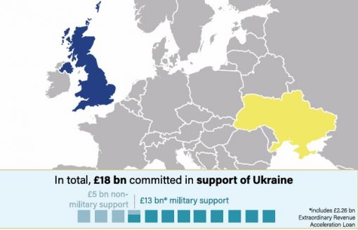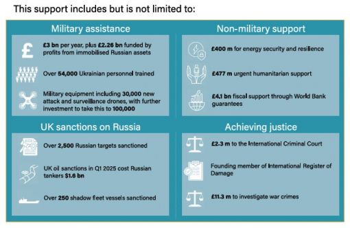Toplamda Ukrayna’ya taahhüt edilen destek: £18 milyar £5 milyar askeri olmayan destek → İnsani yardım, ekonomik destek, yeniden inşa gibi alanları kapsar. £13 milyar askeri destek → Silah, mühimmat, eğitim ve lojistik katkıları içerir. (Bu miktarın içinde £2,26 milyar “Olağanüstü Gelir Hızlandırma Kredisi” yer almaktadır.) Bu destek şunları içerir ancak bunlarla sınırlı değildir: Sol Sütun 1. Askeri Yardım