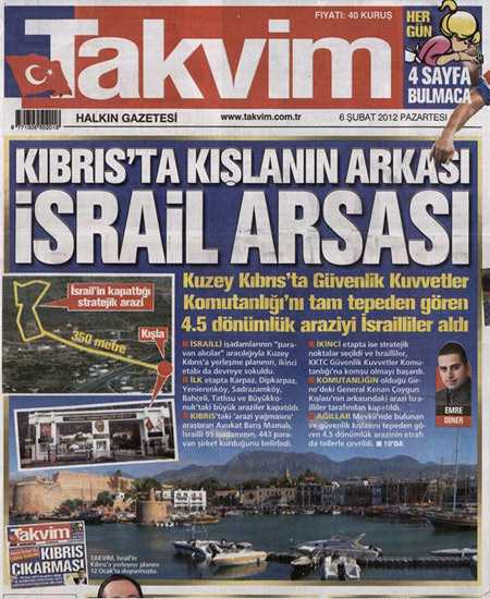 TAKVİM,İsrail’in “Kıbrıs Çıkarması” planını 12 Ocak 2012’deki manşetiyle duyurmuştu. Gündeme bomba gibi düşen o habere göre İsrail hükümetinin desteklediği Yahudi işadamları, bir süredir Kuzey Kıbrıs Türk Cumhuriyeti’nde arazi topluyor. Özellikle Büyükkonuk, Bahçeli, Tatlısu, Karpaz, Dipkarpaz, Yenierenköy, Sadrazamköy ve Girne bölgelerinde arazi kalmadığı belirtiliyor. Yerli avukatlar aracılığıyla paravan şirketler kurup arazi alan Yahudiler’in, lüks siteler inşa ettiği kaydediliyor..