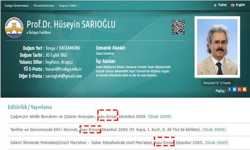 Gazeteport'un haberine göre FBI ‘ın verdiği istihbaratla evine operasyon yapılan ve bilgisayarında yapılan incelemede çok sayıda çocuk pornosu videosuna ulaşılan Trakya Üniversitesi İlahiyat Profesörü ve Rektör yardımcısı Prof. Dr. Hüseyin Sarığlu’nun “Çağımızın Ahlak Bunalımı ve Çözüm Arayışları” isimli kitabını Ensar Vakfı üzerinden çıkardığı ortaya çıktı. Sarıoğlunun üniversite sitesinde yer alan biyografisinde ensar vakfı kitapları yer alıyor.