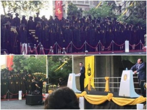 Mezuniyet töreninde kep giyen öğrenciler, Konar konuşma yaptığı sırada sırtlarını dönerek protesto etti.