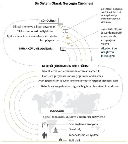 RAND: Bir Sistem Olarak Gerçeğin Çürümesi ![]() Gerçek Çürümesi Araştırma 16 Ocak 2018 Bu rapor, Hakikat Çürümesi'nin nedenlerini ve sonuçlarını ve bunların birbirleriyle nasıl ilişkili olduğunu inceliyor ve Hakikat Çürümesi'nin dört eğilimine dair kanıtları belirlemek ve mevcut dönemle benzerlikleri ve farklılıkları gözlemlemek için ABD tarihinin geçmiş dönemlerini inceliyor. Ayrıca, Hakikat Çürümesi'nin nedenlerini araştırmak ve nedenlerini ve sonuçlarını ele almak için neler yapılabileceğini belirlemek üzere bir araştırma gündemi ve stratejisi de sunuyor. Bir Sistem Olarak Gerçeğin Çürümesi Temel BulgularHakikat Çürümesi Nedir?