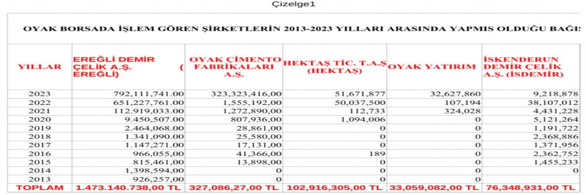 • OYAK'IN BORSADA İŞLEM GÖREN ŞİRKETLERİNİN 2013-2023 YILLARI ARASINDA YAPMIŞ OLDUĞU BAĞIŞ VE YARDIMLAR